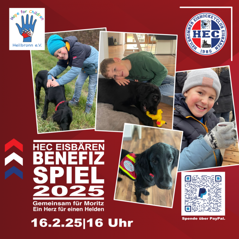 Im Rahmen des jährlichen Benefizspiels der HEC Eisbären möchten wir Sie herzlich einladen, Moritz zu unterstützen. Der neunjährige Junge aus Lauffen am Neckar kämpft tapfer gegen einen seltenen Gendefekt und Epilepsie. Moritz ist ein fröhlicher und lebenslustiger Junge, doch seine Krankheit stellt ihn und seine Familie vor große Herausforderungen. Um ihm mehr Sicherheit und Selbstständigkeit zu geben, haben sie einen treuen Begleiter gefunden: einen Assistenzhund. Dieser kleine Held soll Moritz im Alltag zur Seite stehen und ihn vor allem bei epileptischen Anfällen schützen. Die Ausbildung eines Assistenzhundes ist jedoch mit hohen Kosten verbunden. Rund 25.000 Euro sind dafür notwendig. Dieses Geld wird für die professionelle Ausbildung des Hundes, seine medizinische Versorgung und spezielle Ausrüstung verwendet. Mit Ihrer Spende ermöglichen Sie es Moritz, seinen neuen Begleiter auszubilden und so ein Stück mehr Normalität zu erleben. Aber nicht nur Spenden sind wichtig! Wir freuen uns auch über jede Form ehrenamtlicher Unterstützung. Ob Sie beim Aufbau des Benefizspiels helfen, Tombolapreise spenden, sich um die Verpflegung kümmern, oder einfach nur für gute Stimmung sorgen – jede helfende Hand ist willkommen! Für das Rahmenprogramm unseres BENEFIZSPIELs 2025 bekommen wir GROSSARTIGE Unterstützung von DJ ROBIN, der garantiert die Eishalle zum Beben bringt! Teilen Sie unsere Aktion in Ihren sozialen Netzwerken! Je mehr Menschen wir erreichen, desto größer wird die Unterstützung für Moritz. Nutzen Sie die Hashtags #GemeinsamFürMoritz und #HECEisbären, um unsere Kampagne zu verbreiten. Wir laden Sie herzlich ein, am 16.02.25 um 16.00Uhr zum Benefizspiel der HEC Eisbären zu kommen. Neben einem spannenden Eishockeyspiel haben Sie die Möglichkeit, Moritz persönlich kennenzulernen und mit Ihrer Spende oder Ihrem Engagement einen wichtigen Beitrag zu leisten. Datum: 16.02.2025 Uhrzeit: 16 Uhr Eintritt: Auf Spendenbasis Die Familie Bernhardt, der Förderverein Hope4Children und die HEC Eisbären bedanken sich von Herzen für Ihre Unterstützung.