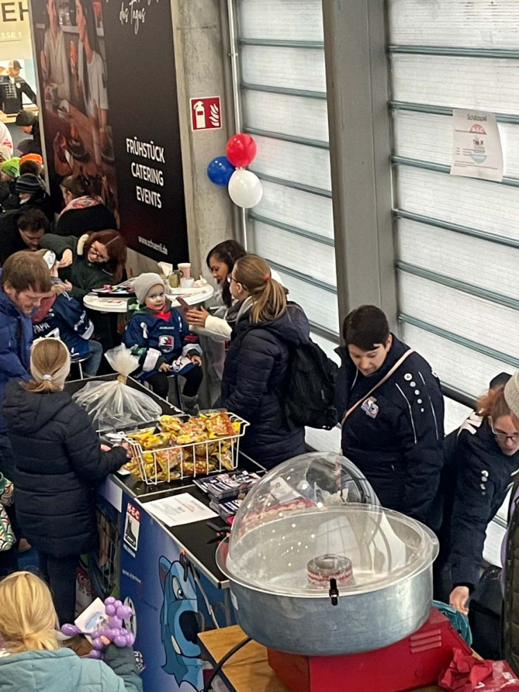 Die Kinder haben die Spieler auf dem Eis begrüßt und in der ersten Pause gezeigt, dass auch sie schon richtig toll Eishockey spielen. So konnte das reichliche Publikum einen Einblick bekommen in die Arbeit, die unsere Vereinstrainer leisten. Auch die Falkenfans waren begeistert und unterstützen den Nachwuchs mit Spenden an unserem unwiderstehlichen Waffelverkauf.